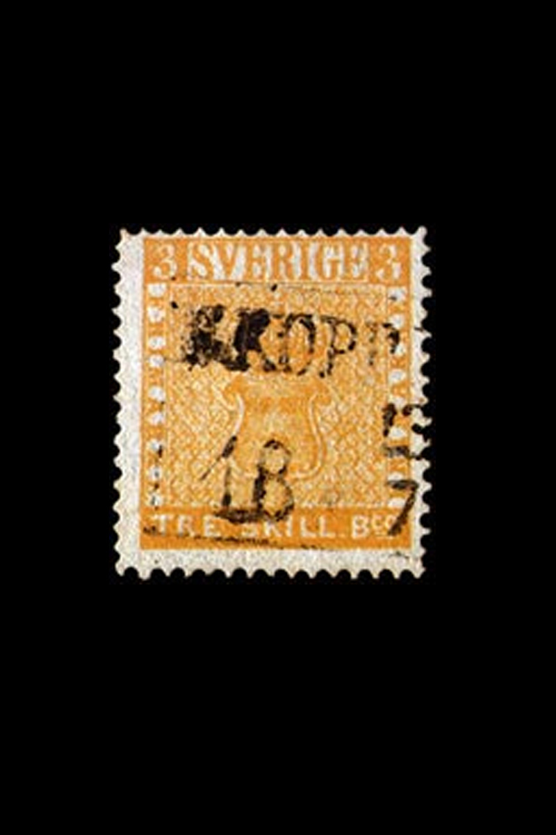 Parte da primeira série de selos para caracterizar o brasão sueco, eles estavam disponíveis em amostras de diferentes cores. Graças a um erro de impressão, os selos foram impressos em um papel amarelo-alaranjado ao invés do papel comum verde. Considerados uma raridade, apenas uma cópia foi descoberta até o momento.